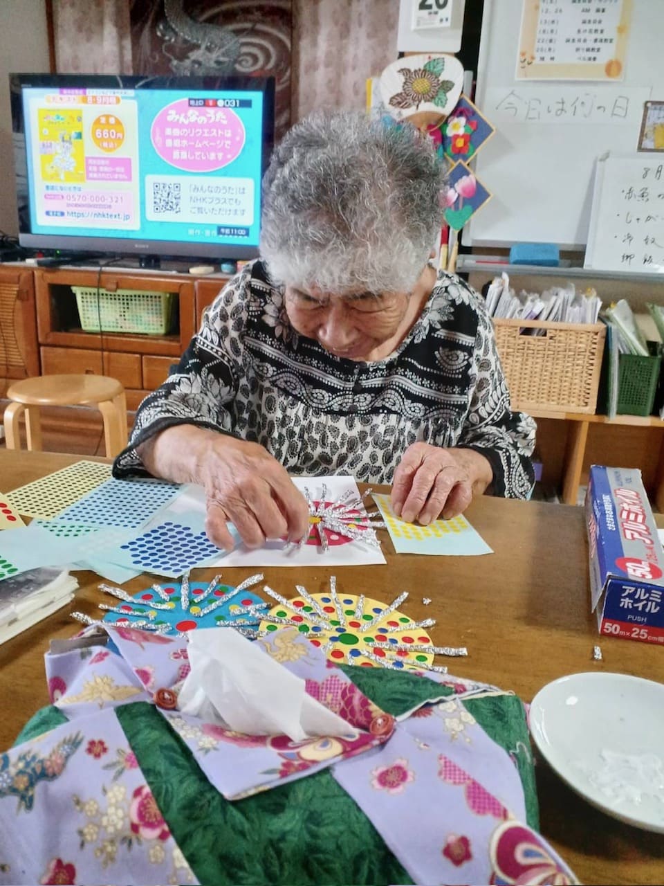 - 色画用紙に棒状にしたアルミはくを貼る。